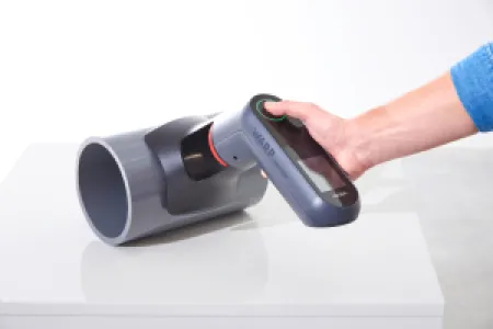 The WARP portable is a mobile, radar-based hand-held gauge for selective wall thickness measurement, specially designed for medium and large pipe extrusion as well as for sheets. The application possibilities are very flexible, whether as a quick centering aid in the start-up process, for final production control or as a stock control device. Not only wall thicknesses at pipe ends can be measured, but also the progression inside a pipe section or a sheet. The measurement itself is performed at the push of a button. The last 500 measured values including the measuring angle on the pipe as well as the time stamp are stored.