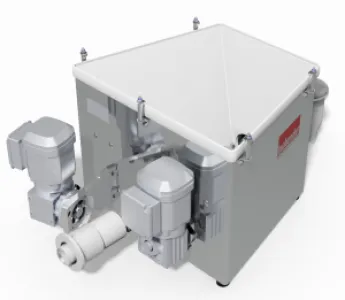 The FlexWall®Plus FW80/1 feeder is ideal for free flowing bulk ingredients. The feeder has the following main components: a stainless steel trapezoidal housing, flexible polyurethane trough with a large trough cross-section, a feed screw, a screw tube, 3 phase motor and a trapezoidal extension hopper.