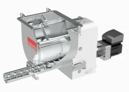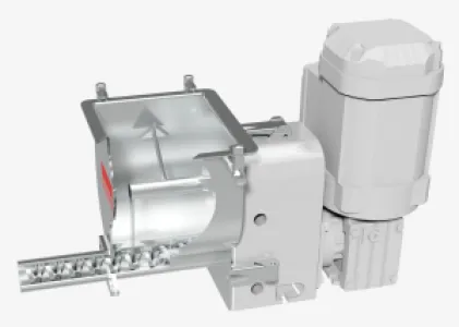 The DSR28 is a feeder ideal for poor or difficult flowing bulk ingredients at low feed rates. The feeder has the following main components: a stainless steel screw trough, an agitator in the screw trough, a screw, a screw tube, a 3 phase AC motor and extension hopper with volumes of 5 dm³ (0.18 cuft), 10 dm³ (0.35 cuft) or 20 dm³ (0.71 cuft).